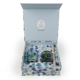 Fresh and elegant, the Bluebell & Hydrangea Blossom Gift Set brings a light floral atmosphere into your home. Inside the beautifully illustrated keepsake box, you’ll find a coordinated glass reed diffuser with natural sticks and a scented candle, both decorated with painterly blue petals.